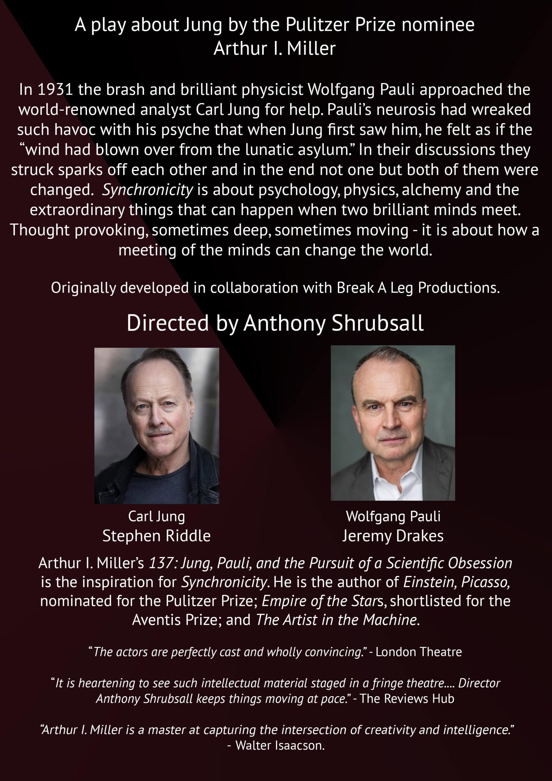 ‘Heavily reminiscent of Michael Frayn’s masterly Copenhagen, Arthur I Miller’s absorbing new play, Synchronicity, probes the links between psychology, physics and alchemy, through the prism of the friendship of the Swiss psychiatrist Carl Jung and the Austrian physicist Wolfgang Pauli…[T]his is an excellent production of a fascinating play.’